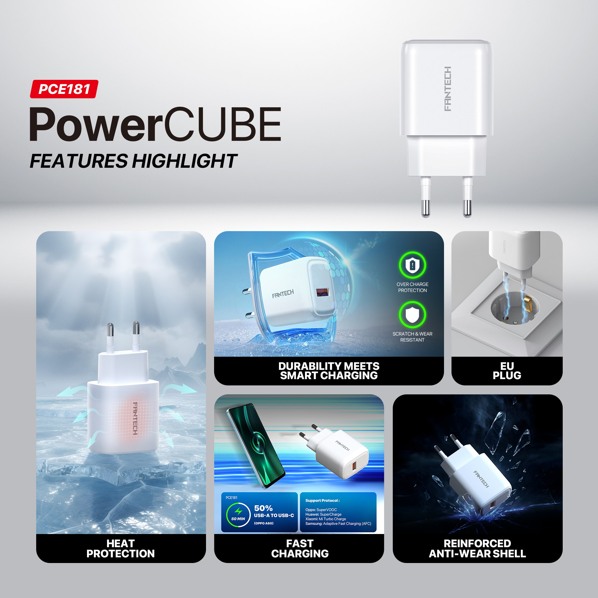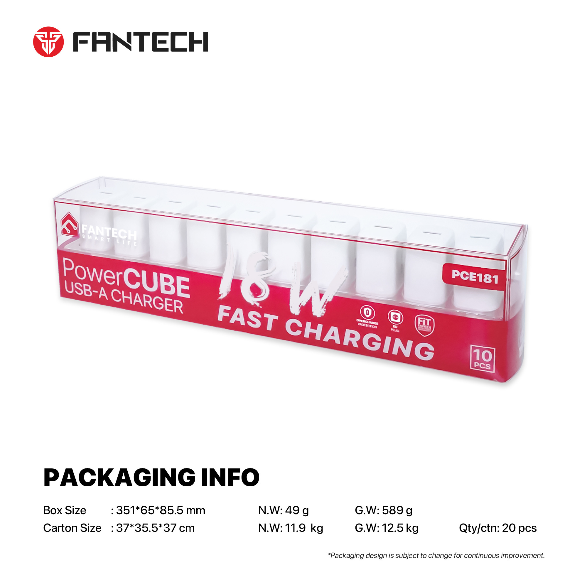 Fantech PCE181 PowerCUBE USB-A Charger 10pcs 18w Durable Anti-Wear Shell Universal Fast Charging
