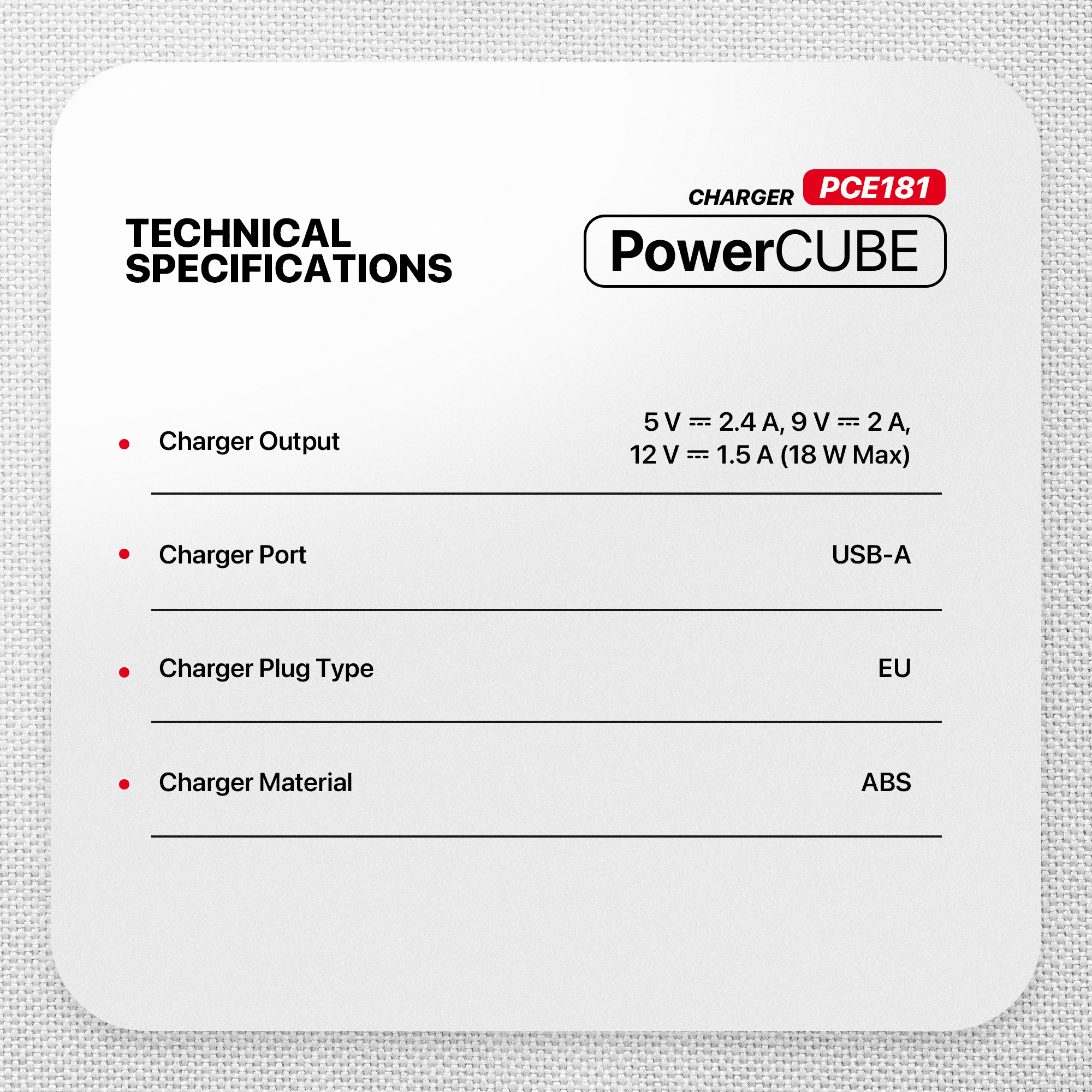 - Charger Output: 5V/2.4A, 9V/2A, 12V/1.5A (18W Max)